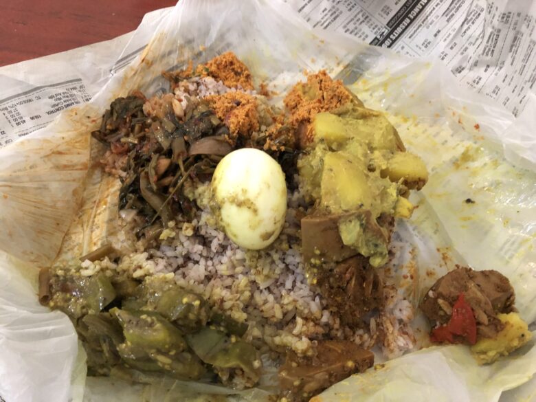 Take Away(テイクアウト)のお弁当にしてもらいました。ビニールで包んで新聞紙で巻くのがスリランカ式😊